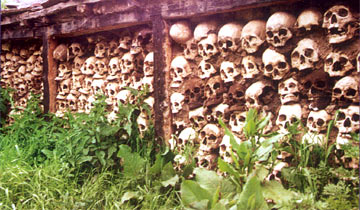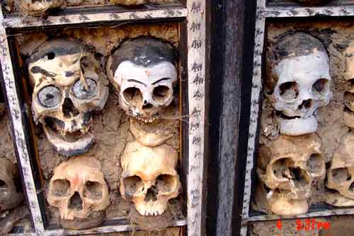 在西藏,人死后尸体全部喂鹰鹫,不留一点,唯独藏北的比如县达摩寺内的多多卡*台,保留了众多死者的头骨,此举堪称世界一绝。子文在他的《苍茫西藏》中写道:原先达木(实为一地。由于是音译,各作者所用汉字也不同)*台三面是骷髅墙,有一人多高,后来在一个大雨如注的日子,浊水从山上滚滚而下,*台的墙倒了。现在的两面骷髅墙,是用剩下的骷髅在近几十年内慢慢垒砌而成的。现在剩下的这两堵墙只有原来的一半高。