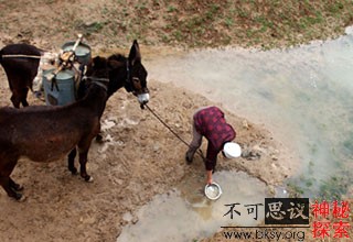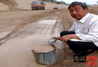 5月22日,在甘肃省环县肖关村公路边,农民程有孝把前一天降雨后积蓄在洼地里的水舀入水桶。这些水经过简单的处理后将作为全家的饮用水。