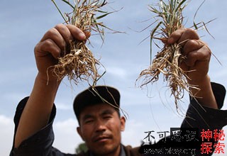 5月22日,甘肃省环县甜水镇甜水街村新庄沟村民小组农民高文银手举自家地里旱死的冬小麦。 由于持续干旱,高文银家的25亩冬小麦今年全部绝收。