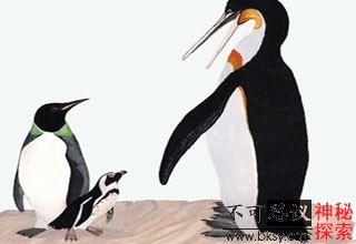 美术家重现了两种古代企鹅的外形(图中两个体型较大的),并把它们与秘鲁现存的唯一一种企鹅(中间者)放在一起。