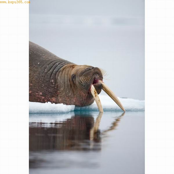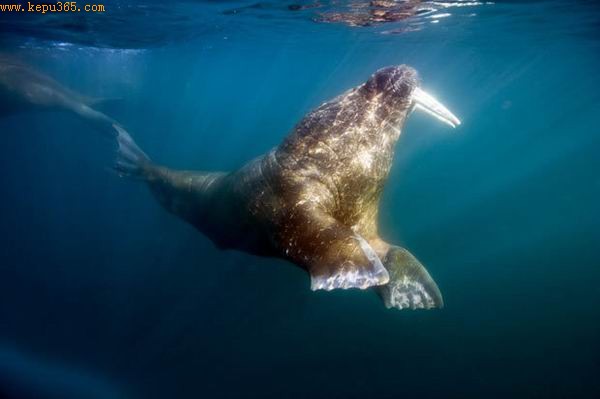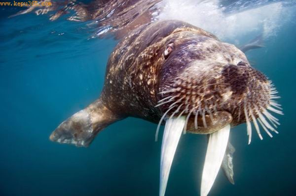 在蒂霍尔曼岛附近海域,摄影师捕捉一头海象在水下游泳时的特写镜头。