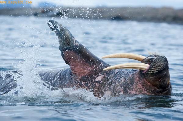 在拉格雅岛附近海域浅水区,一头海象在戏水。