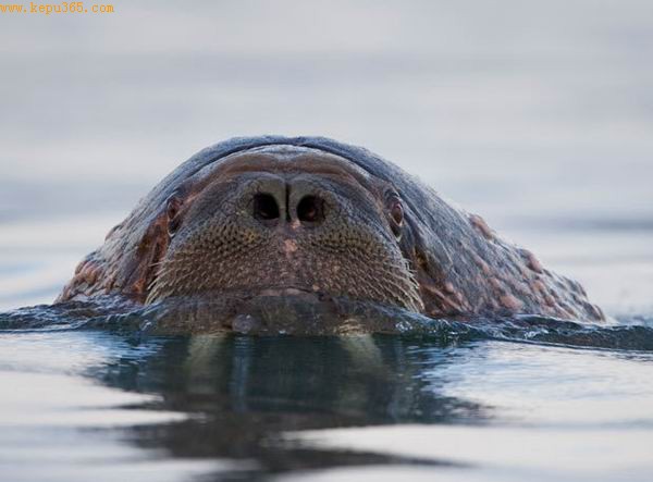 在埃吉奥雅岛附近海域,一头海象浮出水面,露出两个大大的鼻孔。