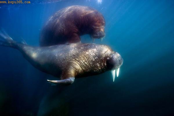 在蒂霍尔曼岛附近海域,两头海象在水下游泳,形影相随。
