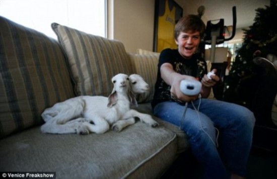 2010年,托德的儿子菲尼克斯与一只双头山羊坐在沙发上