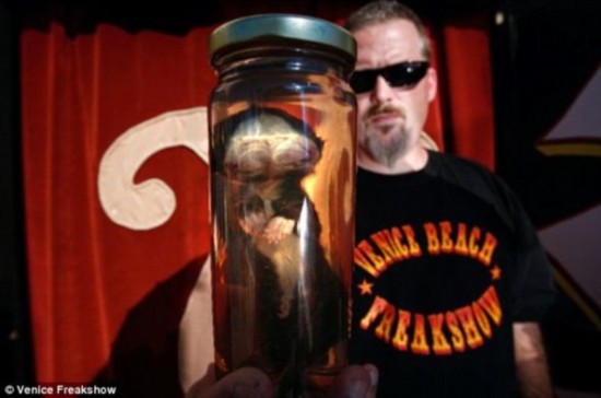 除了活的双头动物外,托德还保存了大量双头动物标本。直到最近,他才在威尼斯滩怪物展上展出“杰克琳&海德”。他在接受《赫芬顿邮报》采访时说:“我必须让它们适应怪物展。‘海德’眼里有沙子,一