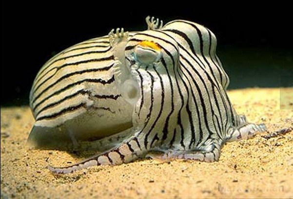 条纹睡衣鱿鱼的学名是“Sepioloidea lineolata”,它实际上是一种墨鱼,但是它们的奇特外形被划入鱿鱼队伍之中。它们的体长仅为5厘米,尽管其外型看起来可爱,但它们却是为数不多的有毒头足类动物之一。它们生活在印度洋南部、太平洋和澳大利亚海域。其色彩艳亮的外表并未完全代表乌贼最显著的特点。