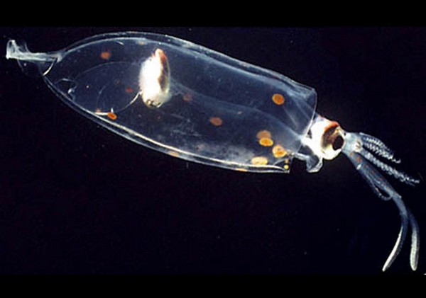 玻璃鱿鱼是鱿鱼物种的一个分支,它们拥有透明身体,其中最为独特的是Cranchia Scabra,该物种具有半透明筒状身体,身体上覆盖着数十个结节突起。