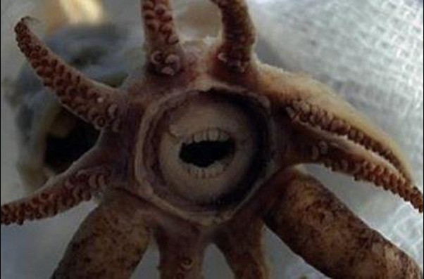 鱿鱼长着坚硬锋利的喙,用于咬碎咀嚼食物,Promachoteuthis Sulcus也不例外。图中所示是它们可怕的牙齿吗?事实上这仅是嘴唇,喙部真正潜藏在后方。 (悠悠)