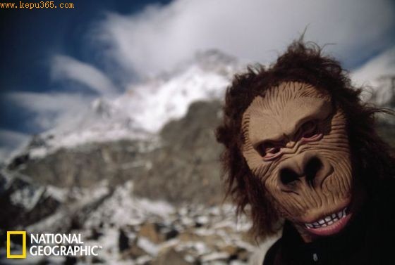 在巴基斯坦克什米尔的南迦帕尔巴特峰,一个登山探险队员戴上了雪人面具,带来了不错的喜剧效果