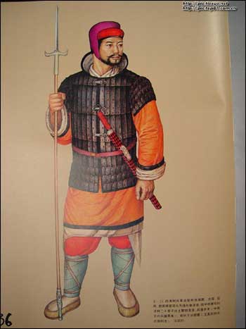 11、图为唐代穿明光甲及戎服的武士复原图。初唐的铠甲和戎服的基本保持着南北朝以来至隋代的样式和形制。贞观以后,进行了一系列服饰制度的改革,渐渐形成了具有唐代风格的军戎服饰。高宗、则天两朝,国力鼎盛,天下承平,上层集团奢侈之风日趋严重,戎服和铠甲的大部分脱离了使用的功能,演变成为美观豪华,以装饰为主的礼仪服饰。“安史之乱”后,重有恢复到金戈铁马时代的那种利于作战的实用状态,特别是铠甲,晚唐时已形成基本固定的形制,唐代的铠甲,据《唐六典》记载,有明光、光要、细鳞、山文、鸟锤、白布、皂娟、布背、步兵、皮甲、木甲、锁子、马甲等十三种。其中明光、光要、锁子、山文、鸟锤、细鳞甲是铁甲,后三种是以铠甲甲片的式样来命名的。皮甲、木甲、白布、皂娟、布背,则是以制造材料命名。在铠甲中,仍以明光甲使用最普遍