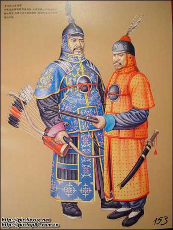 14、图为辽代武士的铠甲和戎服复原图。据《辽史》记载,辽在契丹国时,军队就已使用铠甲,主要采用的是唐末五代和宋的样式,以宋为主。铠甲的上部结构与宋代完全相同,只有腿裙明显比宋代的短,前后两块方形的鹘尾甲覆盖于腿裙之上,则保持了唐末五代的特点。铠甲护腹好象都用皮带吊挂在腹前,然后用腰带固定,这一点与宋代的皮甲相同,而胸前正中的大型圆护,是辽代特有的。辽代除用铁甲外也使用皮甲。契丹族的武官服装分为公服和常服两种,样式没有明显不同,都是盘领、窄袖长袍,与一般男子服饰相同,可能常服比官服略紧身一些。这两种都可作戎服。