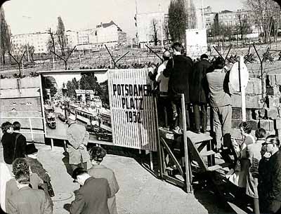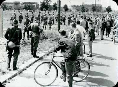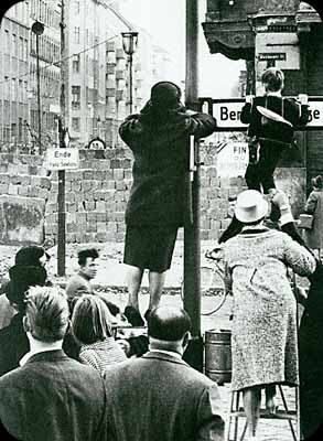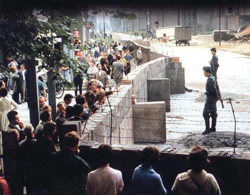 1945年到1961年间,每年约有数十万民主德国公民通过柏林逃往联邦德国。 1961年8月13日凌晨2时,一道道耀眼的探照灯刺破夜空,宣告了柏林市28年东西分隔的开始。星期天,当柏林人一觉醒来时,发现一道40公里长的带刺铁丝网沿着苏联占领区界限被匆匆布下。民主德国人民议院发布命令,用铁丝网封锁西柏林,后改为混凝土墙,建成举世瞩目的"柏林墙",切断了东西柏林间的自由往来。