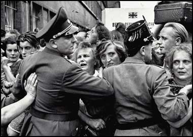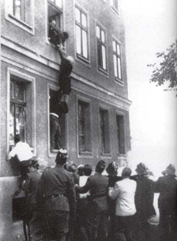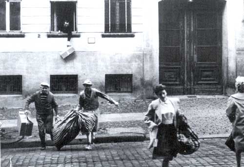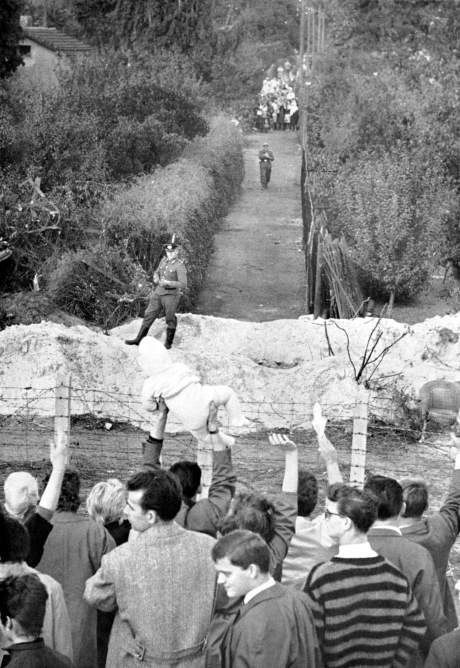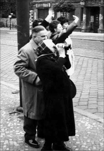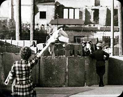 经过一番努力,东柏林妇女终于由属于东德的楼内进入了属于西德的街道(楼上窗内的为东德警察)。