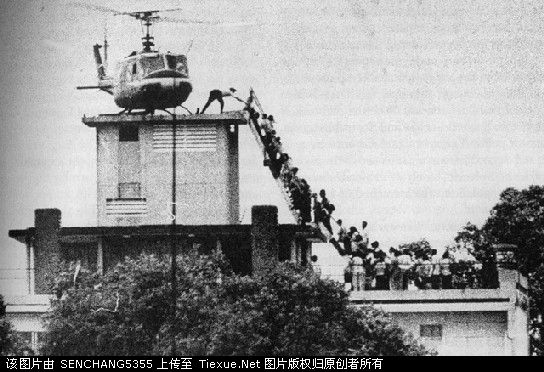 这是美军UH-1直升机用美国大使馆的楼顶当临时机场带南越避难者逃跑,当时UH-1最大的载客纪录达到了四十五人,还有很多人攀抓直升机的起落架或机门随同起飞,体力不支者途中就落入大海而死,更有上不了飞机的原南越政府军官兵对直升机开枪的,记得有个美国电影就有美军特种军官在指挥上飞机时被南越官员击伤,把老婆扔在了西贡的镜头。