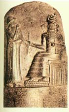 公元前1750年汉莫拉比法典。这部刻在石碑上的法典仍然原封未动的保存在法国巴黎的卢浮宫博物馆中。石碑顶端是矗立于太阳神,同时也是公正之神沙玛什面前的国王。法典的详细内容就位于图画的下面。