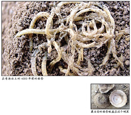 中国科学院地质与地球物理研究所的科学家在13日出版的《自然》杂志上报告说,他们在黄河上游、青海省民和县喇家村进行地质考察时,在一处河漫滩沉积物地下3米处,发现了一个倒扣的碗。碗中装有*的面条状物质,最长的有50厘米。 研究人员通过分析该物质的成分,断定这碗“面条”已经有约4000年历史,比人们以前推测的面条产生时间早1000年,也比欧洲历史上对面条这种食品的记载早了许多年。
