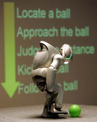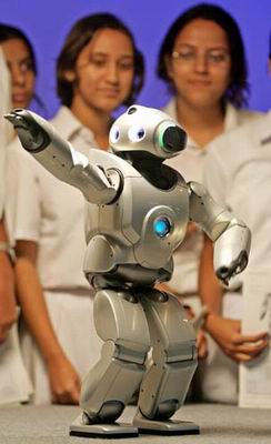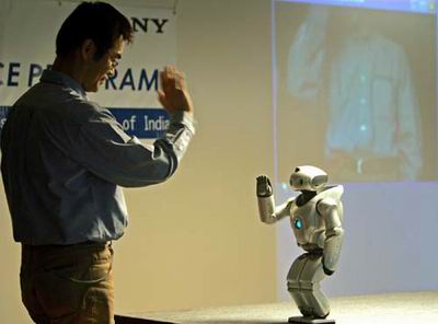 当地时间10月26日,在印度新德里一所学校里,索尼公司开发的双足娱乐型机器人“QRIO”与大家见面。QRIO能识别人类的口语,并作出回答或以动作回应。