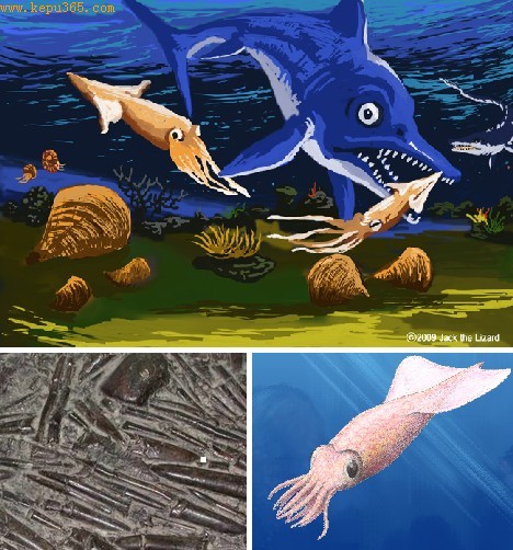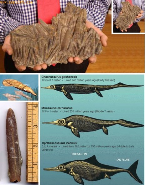 箭石目是乌贼的古代近亲,拥有坚硬钙化骨骼结构。它们的壳在鱼龙胃内堆积,而后又被鱼龙吐出