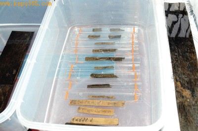 9月9日,长沙市文物考古研究所对外界宣布,对长沙五一广场地铁工地内一东汉古井展开的抢救性考古发掘已经结束,发现简牍数量之大、简牍形制之独特等均为国内罕见。目前,出土简牍被封装于210个大小盆内,未来将展开细致的揭剥、清洗、释文等研究工作。图为1900多年前的木简,字迹清晰秀丽,一些简牍木质纹理尚存,保存非常完好(9月9日摄)。
