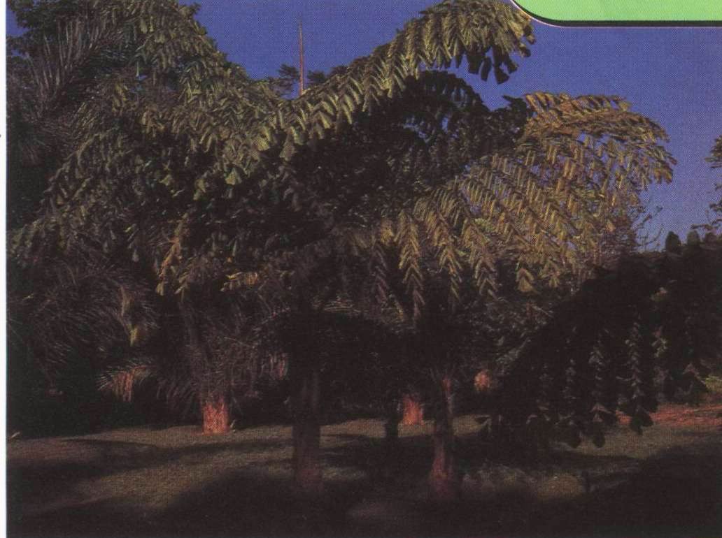 形态特伍 棕榈科鱼尾葵属乔木植物,高10-15(-20)米。茎绿色,被白色的毡状绒毛,具环状叶痕。叶长3-4米,二回羽状全裂,羽片互生,裂片侧面菱形似鱼尾。佛焰苞与花序无糠秕状的鳞秕;花序长约3米,具多数穗状的分枝花序。果实球形,成熟时红色,种子1颗。