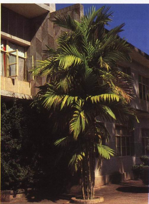 形态特征:棕榈科槟榔属植物。茎丛生,高3-4米,直径2.5-4厘米,具明显的环状叶痕。叶羽状全裂,长1米或更长,约17对羽片,顶端一对合生,叶柄长10厘米或更长。佛焰苞1个,革质,开花后脱落。雌雄同株,花序多分枝,分枝曲折,上部纤细,着生1列或2列的雄花,而雌花单生于分枝的基部。果实卵状纺锤形,熟时由*变为深红色。种子椭圆形至倒卵球形。