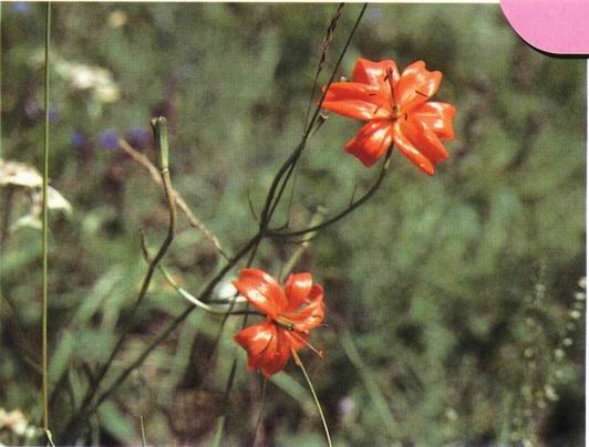 形态特征:百合科百合属鳞茎花卉,株高40-80厘米。茎直立。叶披针形。花喇叭状,花瓣6片,向外翻卷,鲜红色,花期6-7月。蒴果,种子扁平,黄褐色,果熟期9-10月。