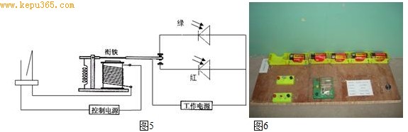 一个火灾自动报警器来演示电磁继电器电路的工作情况(电路图如图5、实物图如图6)。制作完成后,把该装置分别放在各班教室,让学生们课下自己观察、实验,极大地激发学生的热情,同时制作者也有一种成就感。这一举措备受广大学生的青睐。