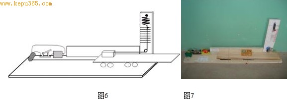 有些课本上的实验按课本上的装置来操作很难完成,这样我就和学生一起研究如何改进实验装置,设计出新的教具,顺利完成实验。如:“探究摩擦力大小与哪些因素有关”的实验是初中物理教学中的重点实验,该实验绝大多数教师采取讲实验的方式进行教学,因为实验过程中要求匀速拉动弹簧测力计,只有这样物体在水平方向上才受平衡力,摩擦力才等于拉力,而实际操作中很难实现匀速拉动,成功的可能性非常小。为此我和学生们设计了新型摩擦力演示器(装置图如图6. 实物图如图7),弥补了这一缺点。改进后的教具具有方便、误差小、可见度大、可操作性强四大优点。在2009年天津市优秀自制教具评选活动中该教具获市级二等奖。其实,物理课本上的很多实验都需要改进,如:研究焦耳定律实验中煤油受热温度变化不是很明显;探究浮力大小等于什么?(阿基米德原理)操作繁琐等。只要我们教师潜心钻研,大胆创新,一定会制造出更合理的教具,使实验效果达到最佳。