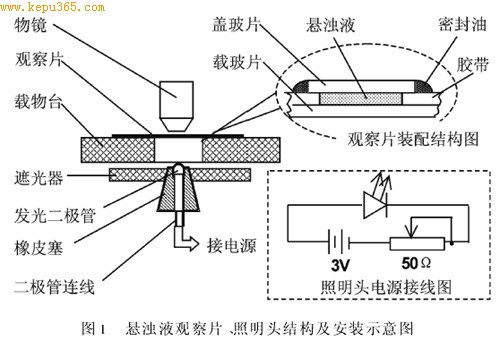 器材:显微镜1台,悬浊液观察片1片,特制的照明头1套,50Ω滑动变阻器1个,干电池2节,电池盒1个,导线1根。