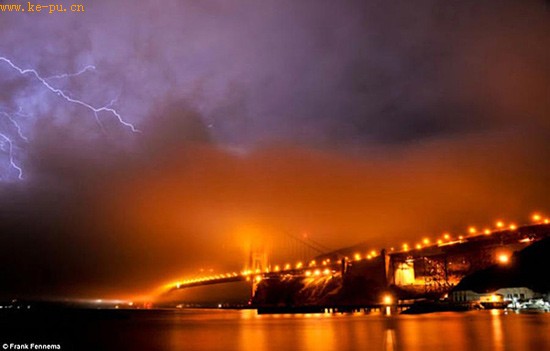 弗兰克·芬奈玛家住加州蒂伯龙小镇,被惊醒后循着雷暴,驱车10英里(约16公里)到达金门大桥,由于风雨交加,他拍摄时坐在车里,将蒙上斗篷的相机伸出窗外,并使用遥控快门拍摄下了这组壮观照片。
