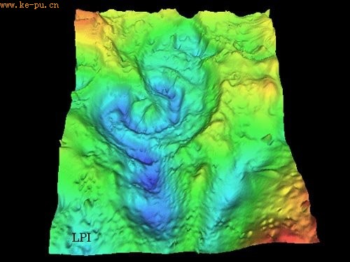 希克苏鲁伯陨坑(Chicxulub crater)是一个位于墨西哥犹加敦半岛的撞击陨坑,埋藏在地表之下。如图所示,这张3D图像显示的是希克苏鲁伯陨坑60度的重力场和磁场变化。造成该碰撞陨坑的小行星直径达到20公里,该碰撞灾难可形成阻挡太阳光线的物质,被认为可能杀死地球上所有的恐龙。