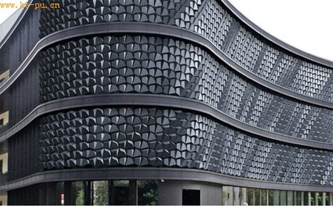 如果觉得上面的这些建筑外观太过虚幻,我们就来看看更具体点的东西吧——海波面(Hyposurface),这是一种由大量玉米脆片大小的三角曲面构成的建筑表面,并且由于各曲面个体张开方向的不同, 使得整个建筑表面拥有液体的流动效果。此外,它还能根据外界的变化而做出相应的预先设置反应,例如对光与声音的反应,等等。它甚至可以模仿出经过它的路人模样。不过,如果未来的都市都遍布 Hyposurface的话,我们的都市将会看起来很繁忙。