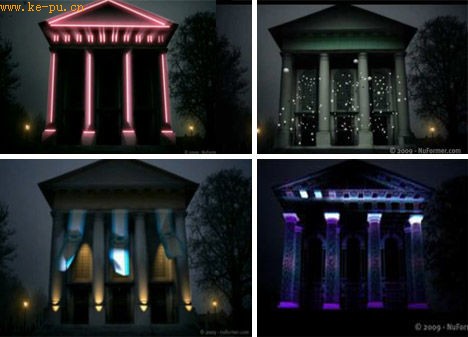 NuFormer公司则为我们展示了纪念性建筑物丰富多彩,晶莹剔透的一面。当电脑成像经过调试而匹配建筑物后,建筑物的外观就可以随意改变,令我们目眩。