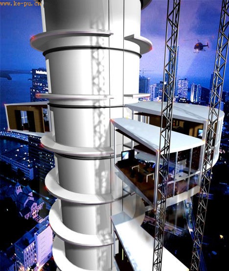 如图所示的动态大楼都是在工厂预先建造完毕后才一层一层组装起来的,就像搭积木一样。每一个模块都是独立的一部分,仅需要从大楼核心部分获取电力和其他资源而已。换句话说,人们可以单独撤换任何一个有问题的模块。
