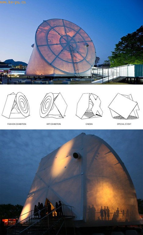 如果从适应性的角度来看,位于韩国的这栋重达160吨的建筑则包含了多种功能于一身。韩国人称之为变形金刚(Transformer),它是一个四周由轻型可透性膜包裹的四方体。当需要转移位置时,该建筑的整体结构可以重新组合并适应新的需要。