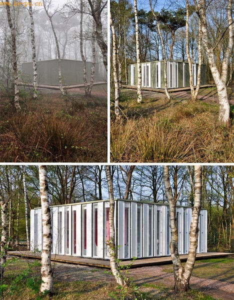 在上图你所看到的是一间略有不同的度假小屋。它的四周是由一块块竖条状落地窗组成的,上面还搭配有可滑动的百叶窗。当这些扇叶打开的时候可以增加通光性,当他们关起时,则能保存屋内的能量 和温度,让居住着感到舒适。它有一个有趣的名字,旋转木马(Merry-Go-Round)。虽然我们可能会担心这间屋子的屋顶在下雨天时的表现,但总的来说我们还是很乐意在家庭外出旅游时看到它的。