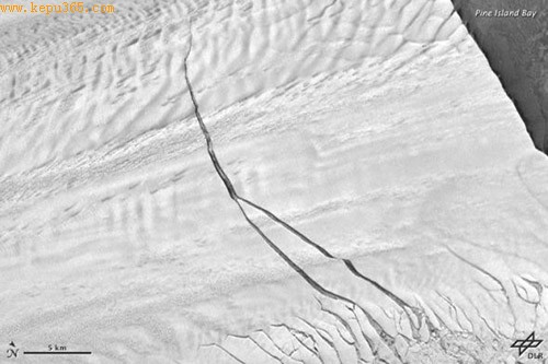 2011年10月14号,执行美国宇航局“冰桥计划”的航天飞机飞越南极松岛冰川(PIG)时,机上的科学家们获得了一个惊人的发现:松岛冰川冰舌上有一条长约29公里的巨大裂缝。这条裂痕宽80米,深50至60米。